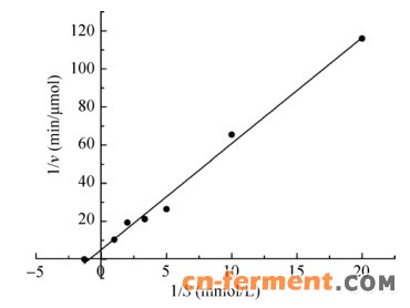 | 图 6 双倒数作图法测定MCO酶反应动力学参数Fig. 6 Analysis of enzyme kinetics of MCO by Lineweaver-Burk plotting |