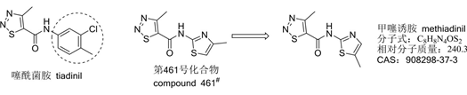 日本农药株式会社于1996年公布的噻酰菌胺(tiadinil)的专利,其中包括列表化合物第461号,甲噻诱胺应是在其基础上对噻唑环优化得到的。其具有很好的诱导活性,对烟草病毒病和水稻稻瘟病、黄瓜霜霉病、黄瓜细菌性角斑病等病害有一定的防效。一般在作物苗期或未发病之前使用,持效期可达10~15天。初步研究发现,该化合物不仅可以抑制病原真菌菌丝的生长,也可以使菌丝畸变,而且还能抑制病原真菌孢子的萌发,或使孢子产生球状膨大物。