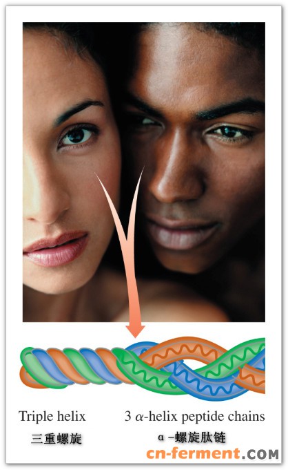 (d)胶原蛋白的四级结构是两个或三个以上三级单元的组合,并通过与三级结构中相同的相互作用使其稳定化;这个时候胶原蛋白具有稳固的纤维状结构,成为胶原纤维。