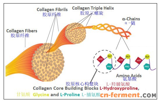 甘氨酸、脯氨酸和羟脯氨酸--胶原蛋白中最丰富的三种氨基酸-- 经常最终存在于成纤维细胞中,它位于结缔组织如皮肤中的特殊细胞中。