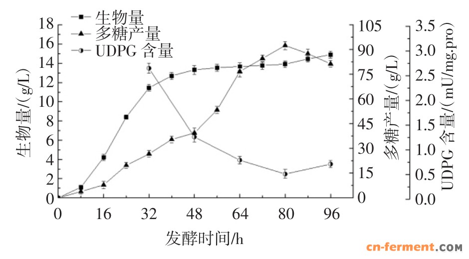 利用5 L发酵罐对pH6.0~5.0组进行产量验证,每隔8 h取样一次。普鲁兰多糖多糖合成及生物量累积趋势如图5所示,普鲁兰多糖产量在发酵80h时达到最高,相较于仅调节初始pH6.0发酵时间缩短8 h左右,同时产量也有显著提高,此时普鲁兰多糖产量达到(92.5±2.41)g/L,生物量达到(13.95±0.35)g/L。发酵80 h后继续反应,普鲁兰多糖产量开始下降,同时生物量增高,发酵96 h生物量增高值(14.91±0.29)g/L,而普鲁兰多糖产量下降至(81.33±2.01)g/L。产生此现象可能是由于普鲁兰多糖积累到一定水平,对其合成产应产生抑制作用,从而使普鲁兰酶开始分解普鲁兰多糖,为菌体合成提供碳源,从而使生物量有明显增长。UDPG含量的变化趋势也同样印证了这一点,UDPG含量先处于较高水平,随普鲁兰多糖合成加剧,UDPG含量迅速下降并在多糖产量达到最高时处于最低谷,在多糖产量降低时又有些许上升。又经相关性检验得出两者相关性系数为-0.905,则普鲁兰多糖产量与UDPG含量在0.01水平上显著相关,由于相关性系数为负,所以两者呈显著负相关关系。