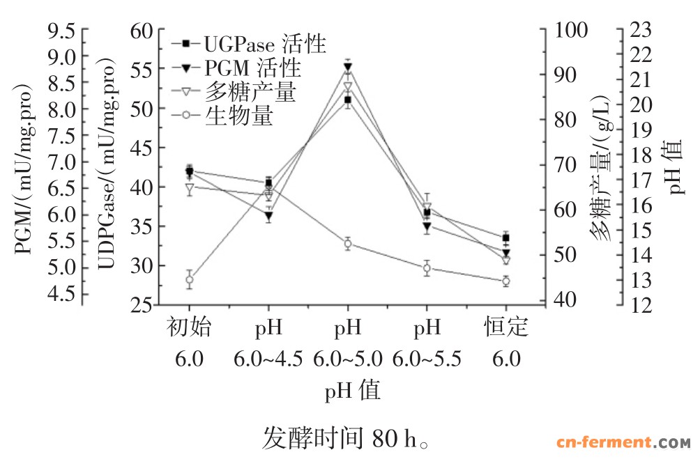 从图4总体可看出,在pH6.0~5.0条件下发酵80 h后UGPase和PGM的活性均高于其他pH条件下的活力,同时此条件下的多糖产量也高于其他组,这一结果显示这些pH值条件下的酶活力与普鲁兰多糖的生产规律相似,因此证明了这两种酶对多糖生产的影响。在初始pH6.0条件下UGPase和PGM的活性与pH6.0~4.5组相近,同时普鲁兰多糖产量相近,分别为(65.21±2.78)g/L 和 63.21 g/L,而此时初始pH6.0条件下的发酵pH值为4.76左右,证明这两种酶的活性对pH值变化较为敏感。在后期控制pH值恒定的四组中酶活力受pH值影响,随pH值由低到高,呈现一种先降低后升高的变化趋势,并在pH5.0表现出最高比活力,同时可以观测出普鲁兰多糖产量呈现这一态势。从而可在酶学上印证后期调节pH值至5.0更利于普鲁兰多糖合成。而生物量的变化受酶活影响并不十分明显,初始pH值6.0组在发酵80 h时酶活与pH6.0~4.5酶活基本一致而生物量却差异明显。后期调控pH值的四组,生物量则与pH值的变化相关,可看出后期pH值偏低更利于菌体生长。