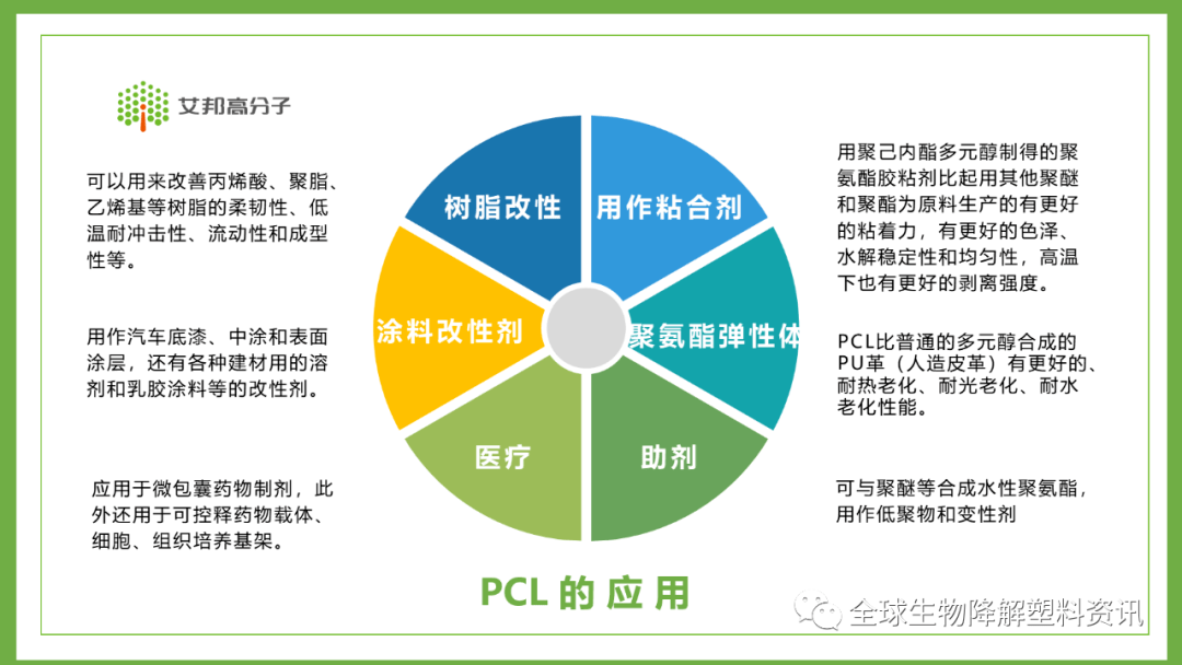 聚ε-己内酯(PCL)是由ε-己内酯经开环聚合得到的低熔点聚合物,其熔点仅62℃。PCL的降解性研究从1976年就已开始,在厌氧和需氧的环境中,PCL都可以被微生物完全分解。由ε-己内酯开环后得到的己内酯衍生物如己内酯改性的多元醇,己内酯丙烯酸单体,己内酯聚合物很成功地用作化学反应中间体和改性剂。