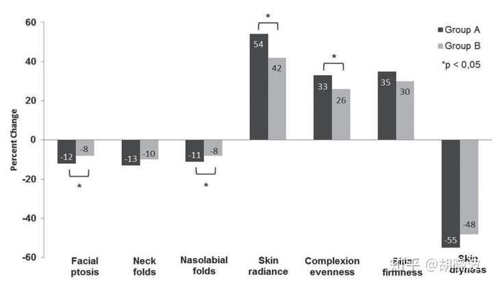 总的来说,某些指标上面是有效的。一部分和抗衰老相关的指标是有差别的,比如脸部下垂程度、皮肤光泽度、肤色均匀程度等等。但奇怪的是,皮肤的紧致度好像没有差别。