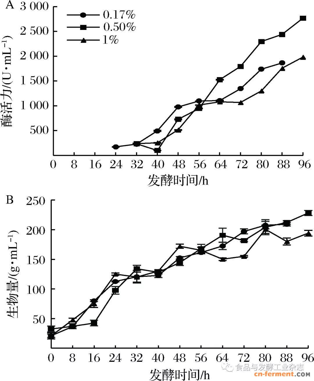 A-不同甲醇添加量对酶活力的影响;B-不同甲醇添加量对生物量的影响