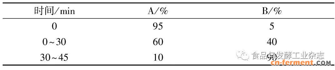 酶活测量采用高效液相色谱(HPLC)法[18]:量取1.0 mL质量浓度为300 μg/mL的芦丁标准溶液加入到10 mL的离心管中,再加入980 μL柠檬酸-磷酸氢二钠缓冲液(pH 4.0),漩涡混匀,置于60 ℃ 水浴锅中保温10 min,迅速加入20 μL酶溶液,混匀,在60 ℃恒温水浴锅中反应15 min后立即放入沸水中灭活12 min,冷却后过0.22 μm滤膜,空白对照组以灭活的酶液代替原酶溶液,其余步骤同上。然后利用高效液相色谱仪检测芦丁含量并依此计算酶活。使用Symmetry C18反相柱,柱温为35 ℃,紫外检测波长为280 nm,进样体积20 μL,流速0.25 mL/min,走样时间60 min,流动相为A: 0.5%甲酸水溶液,B:乙腈,经优化得出的梯度洗脱条件如表1所示。