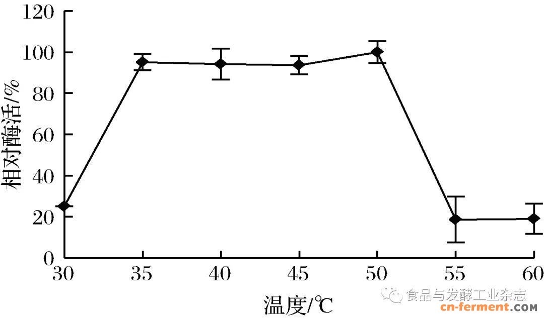 图4 温度对固定化α-L-鼠李糖苷酶活力的影响