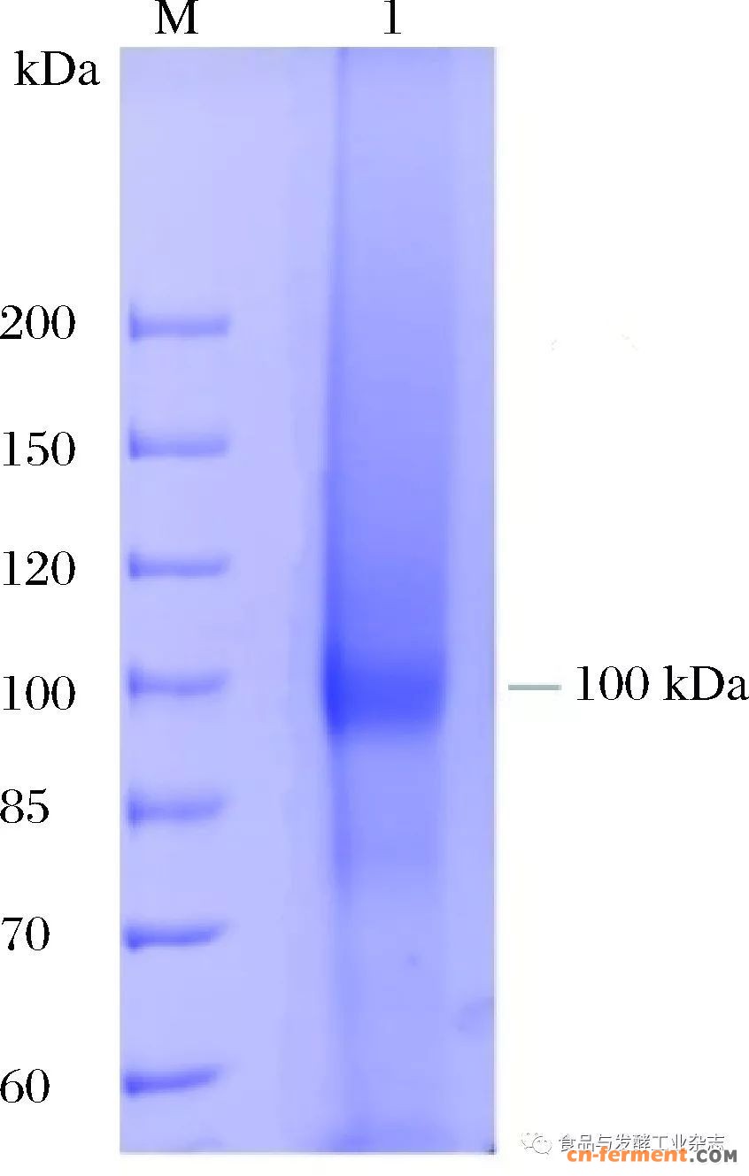 采用SDS-PAGE鉴定重组α-L-鼠李糖苷酶,得到结果如图2,泳道中可见一单一条带,分子质量约100 kDa,与原始黑曲霉α-L-鼠李糖苷酶大小相似。整体来看发酵上清中目的蛋白纯度高,杂蛋白含量较低,可直接对发酵上清液进行固定化操作。