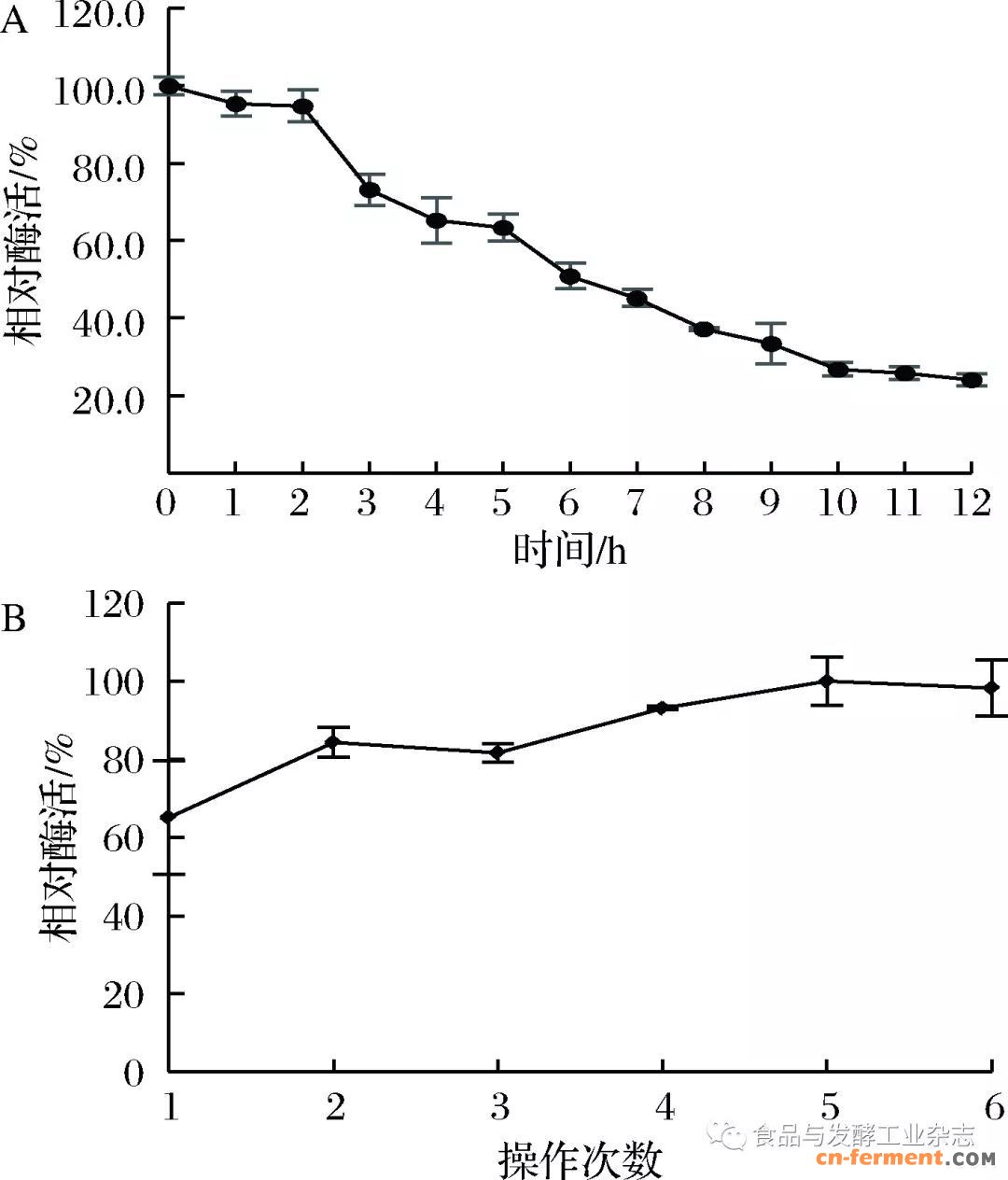 将固定化酶置于pH为4的柠檬酸盐缓冲液中50 ℃温浴,每隔1 h取适量固定化酶依酶活反应体系测定酶活,以初始酶活为100%,计算相对酶活。