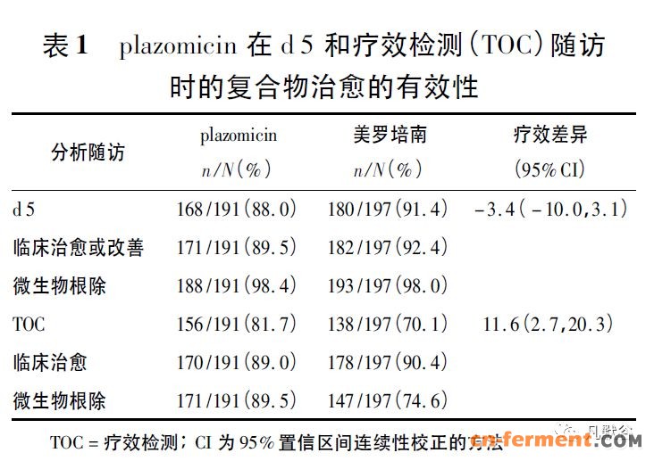 在iv 治疗4 ~ 7 d 后( M = 5. 1 d) ,可以转换为口服抗菌药,如左氧氟沙星。结果表明,使用plazomicin 的患者中,7% ( 21 /300 ) 血清肌酐增加> 0. 5 mg·mL-1,而美罗培南组为4% ( 12 /297) 。