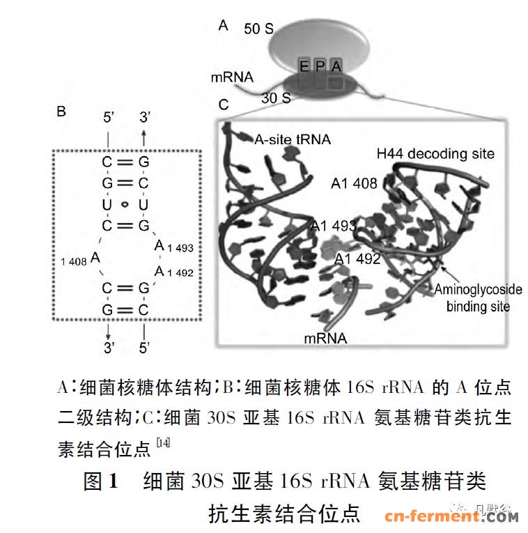 氨基糖苷类药物通过与细菌核糖体30S 亚基的16S rRNA 解码区A 位点特异性结合来发挥作用,使16SrRNA 形成稳定的内环结构[8],如图1 所示。