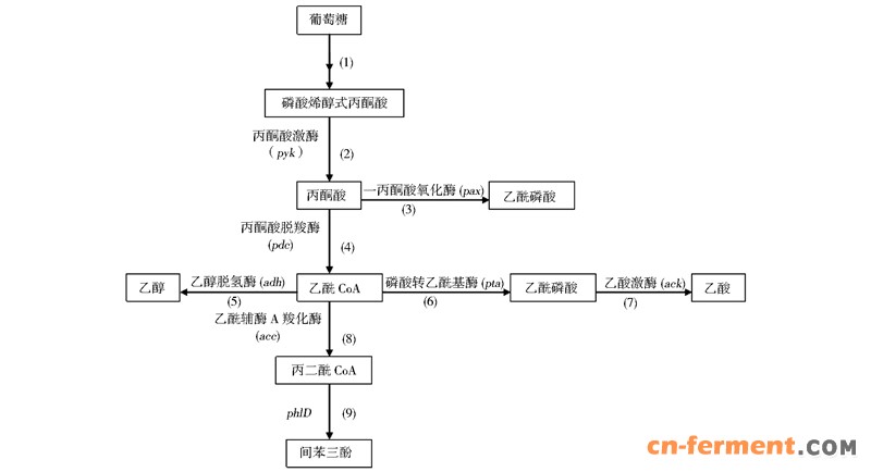 生物合成法生产间苯三酚受到几个不同方面的限制,比如间苯三酚自身的理化性质,phlD催化过程中底物、关键酶等的限制,基因工程菌高密度发酵条件的影响等。针对以上限制因素,可以从以下几个方面采取措施来提高间苯三酚的表达量。