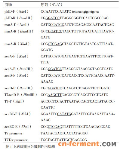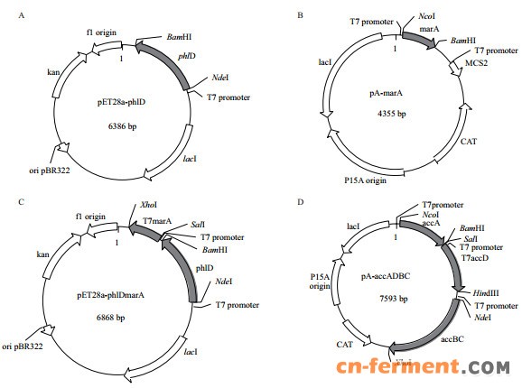 以E. coli DH5α全基因组DNA为模板,扩增marA(GenBank ID:947613)、accA(GenBank ID:944895)、accBC(GenBank ID:947758,GenBank ID:947761)和accD(GenBank ID:946796)。将marA插入pACYCDuet-1得到重组质粒pA-marA(Nco I和BamH I,图 1-B)。以pA-marA质粒为PCR模板,克隆连接有T7启动子的marA,并插入pET28a-phlD质粒,得到pET28a-phlDmarA重组质粒(Sal I和Xho I,图 1-C)。将accA和accD分别插入pACYCDuet-1质粒,得到重组质粒pA-accA(Nco I和BamH I)和pA-accD(Nco I和BamH I); 以pA-accD为模板克隆T7accD片段,并插入pA-accA得到重组质粒pA-accAD(Sal I和Hind Ⅲ); 最后将accBC插入pA-accAD质粒的得到重组质粒pA-accADBC(Nde I和Xho I,图 1-D)。用T7引物与基因特异引物组合法进行重组子的PCR筛选,并测序确认。