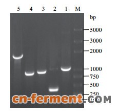 | 图 2 phlD的全合成以及marA、accA、accD和accBC克隆琼脂糖凝胶电泳M:DNA marker; 1:phlD; 2:marA; 3:accA; 4:accD; 5:accBC |