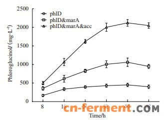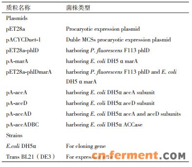 4 结论本研究通过在BL21(DE3)菌株中异源表达来自荧光假单胞菌的phlD基因,成功构建间苯三酚的胞内生物合成途径; 同时超表达了来自E.coli DH5α菌株的marA和ACCase基因,提高了工程菌对间苯三酚的抵抗能力,提高了胞内合成间苯三酚的直接底物丙二酰辅酶A的含量。
