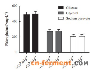 | 图 7 葡萄糖、甘油和丙酮酸钠不同碳源及Ca2+/Mg2+对间苯三酚产量的影响 |