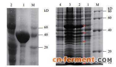 | 图 4 SDS-PAGE蛋白分析(A)M:DNA marker; 1:含pET28a-phlD的BL21(DE3)细胞经IPTG诱导12h的粗提液; 2:阴性对照.(B)M:DNA marker; 1, 4:阴性对照; 2, 3:同时含有pET28a-phlDmarA和pA-accADBC的BL21(DE3)细胞经IPTG诱导12 h和40 h后的粗提液; M:蛋白marker(kD) |