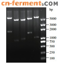 | 图 3 重组质粒pET28a-phlD、pET28a-phlDmarA、pA-accAD和pA-accADBC的酶切鉴定图谱M:DNA marker; 1:pET28a-phlD(BamH I/Nde I); 2:pET28a-phlDmarA(Xho I/Nde I); 3:pA-accAD(Sal I/Hind Ⅲ); 4:pA-accAD(Nco I/Xho I); 5:pA-accADBC(Nde I/Xho I) |
