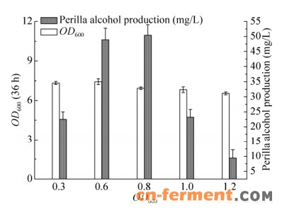 | 图 2 不同诱导OD600值对紫苏醇合成的影响 Figure 2 Effect of different OD600 on perillyl alcohol production. |