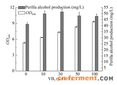 | 图 6 VB2对合成紫苏醇的影响 Figure 6 Effect of VB2 concerntration on perillyl alcohol production. |