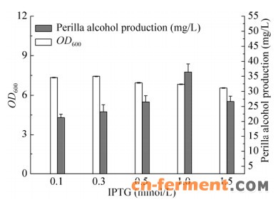 | 图 3 IPTG浓度对工程菌合成紫苏醇的影响 Figure 3 Effect of IPTG concentration on perillyl alcohol production. |