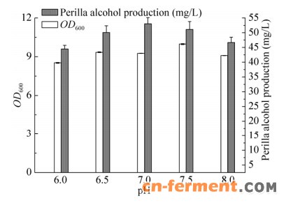 | 图 5 pH对工程菌合成紫苏醇的影响 Figure 5 Effect of pH on perillyl alcohol production. |