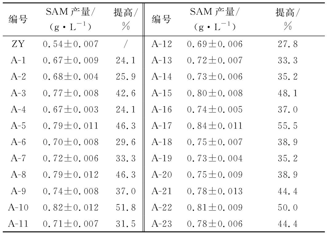 ARTP照射菌株ZY 180 s,培养后涂布于乙硫氨酸筛选平板,挑选相对较大的单菌落进行摇瓶发酵培养。经过5轮诱变,共获得比出发菌株SAM产量高20% 的突变株23株。通过摇瓶复筛,突变株A-17的SAM产量最高,较出发菌株ZY提高了55.5%(表1)。因此,选择突变株A-17为进一步诱变的出发菌株。