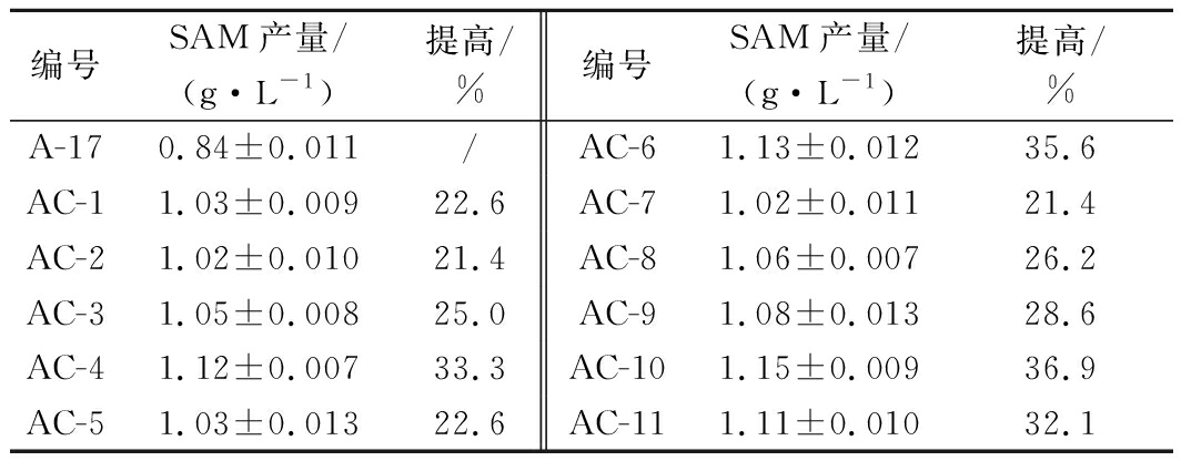 突变株A-17经700 GY γ-射线照射4轮,共获得比出发菌株SAM产量高20% 的突变株11株。通过摇瓶复筛,突变株AC-4、AC-6和AC-10的SAM产量提升较高,其中突变株AC-10的SAM产量达到1.15 g/L,比突变株A-17提高了36.9%,比菌株ZY提高了130.0%(表2)。