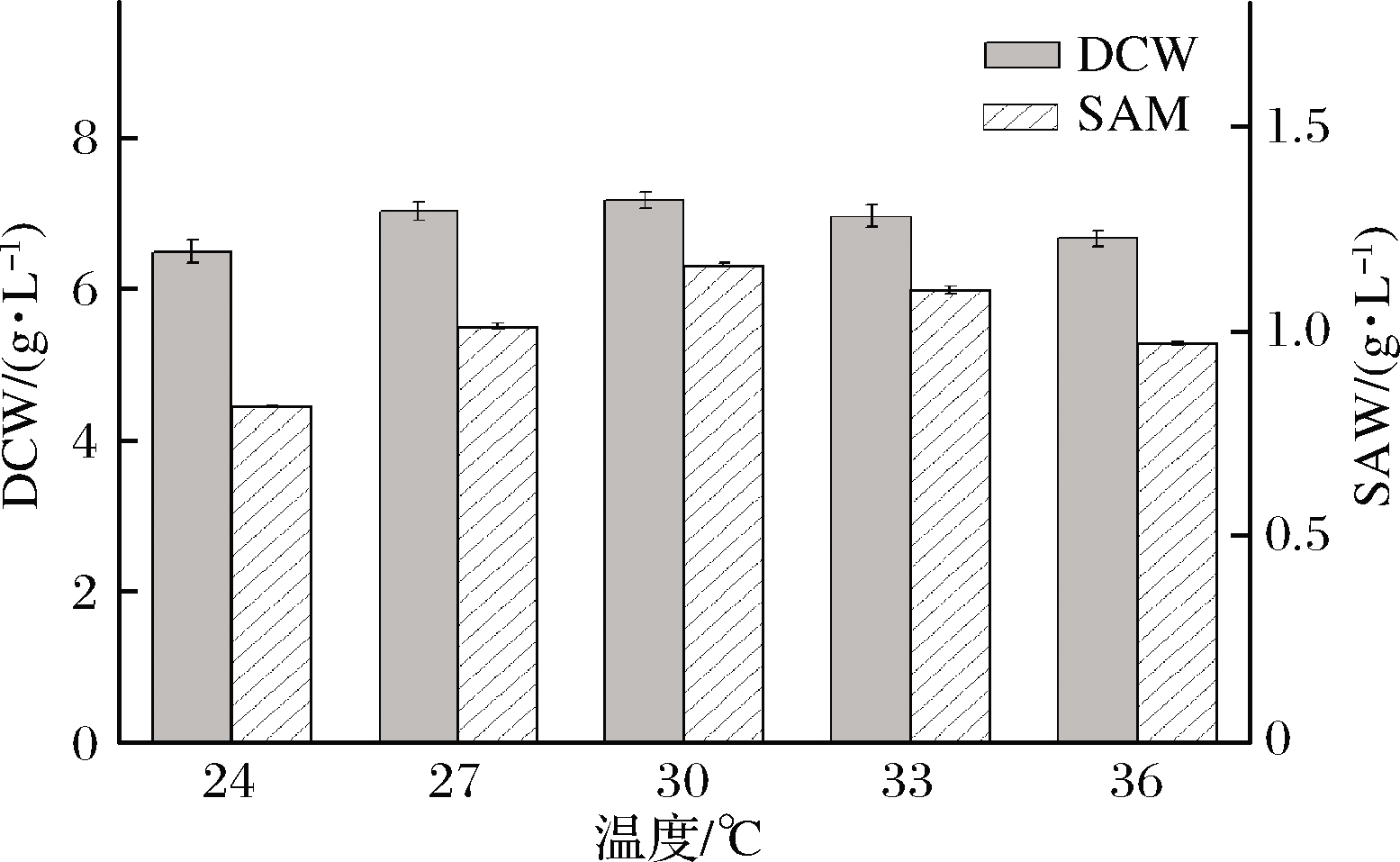 Fig.3 Effect of temperature on growth and SAM titer