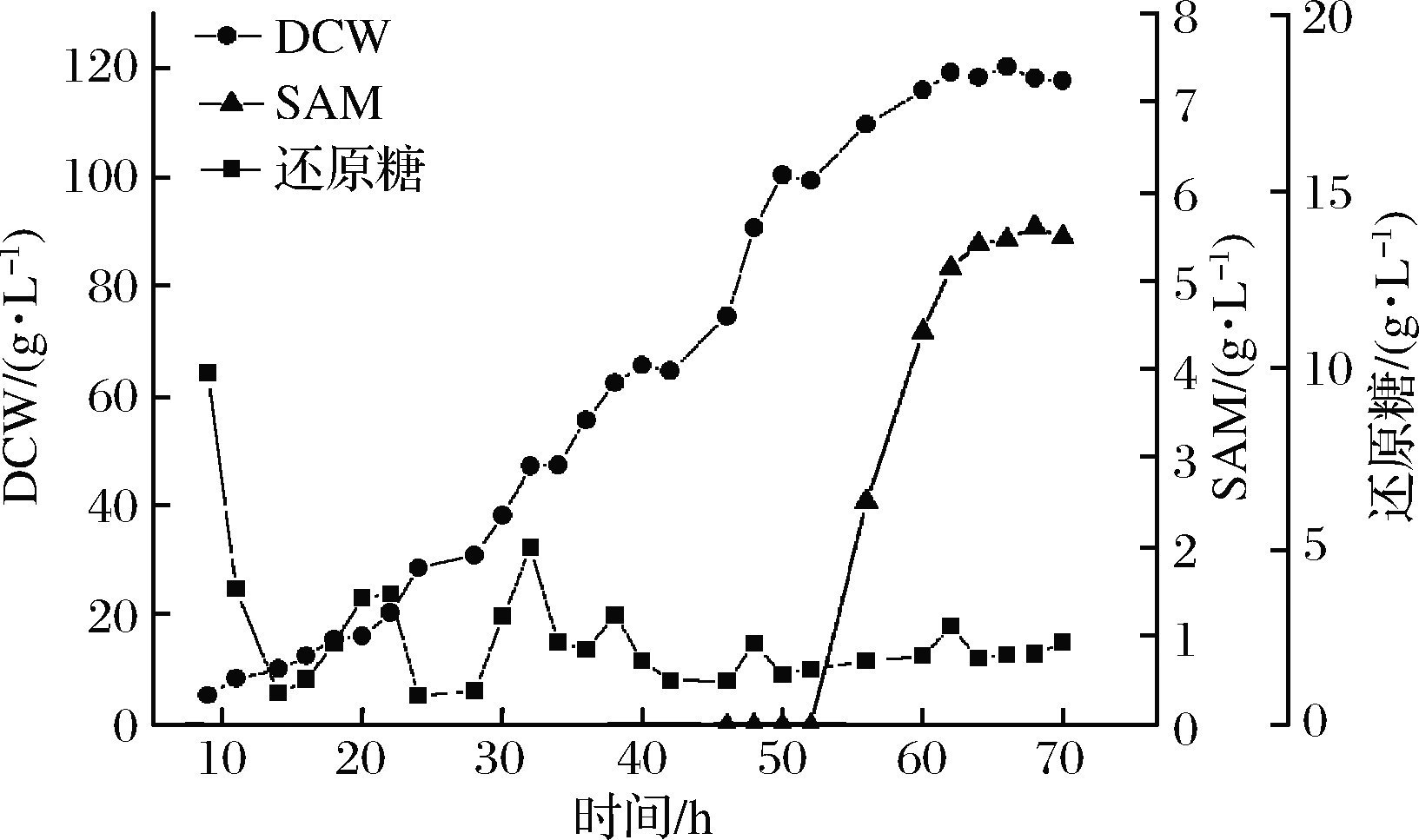 发酵罐装液量为3 L,经过空消、实消灭菌后,种子培养基以10%(体积分数)接种到发酵罐中。控制温度、pH,罐压调控在0.05 MPa,以200 r/min的搅拌速度开始发酵,发酵全程通过控制搅拌转速与葡萄糖流加速度,使溶氧保持在10%~20%,最高转速为750 r/min。发酵过程中每隔2~3 h取样,测定还原糖、菌体量、SAM含量等参数。