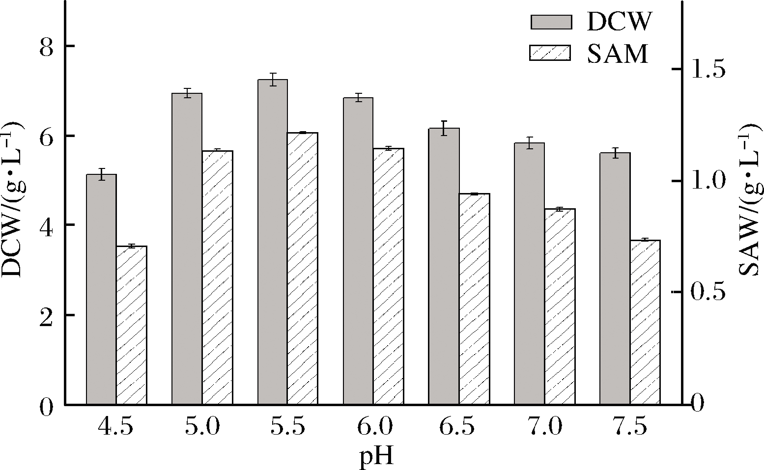 pH会对菌体细胞结构、参与代谢的各种酶活性力产生较大影响,间接影响菌体对培养基的利用,菌体的生长以及产物的生成[17]。在30 ℃下研究了不同初始pH值对突变株AC-10生长和SAM产量的影响。由图4可知,初始pH由4.5提高到7.5的过程中,SAM产量和生物量变化显著,且偏酸性环境有利于菌体生长和SAM生成,初始pH为5.5时菌体量及SAM产量达到最大值,分别为7.24 g/L和1.21 g/L。因此,选择初始pH 5.5为最适pH。