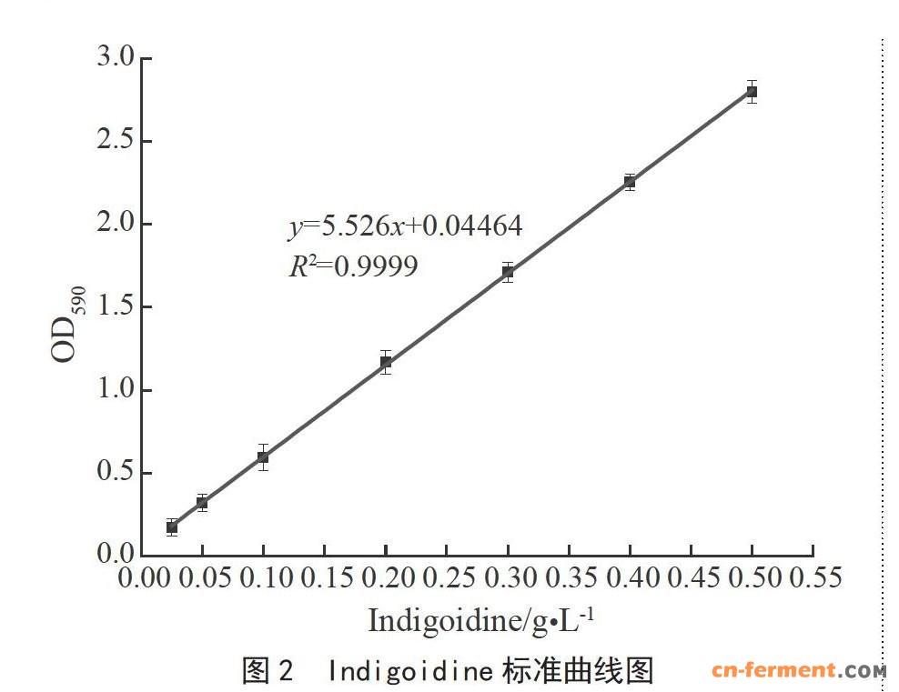 (2)Indigoidine产量计算。取发酵液50 mL于离心管中,12 000 r·min-1离心20 min,弃上清,用蒸馏水清洗沉淀2次。向沉淀中加入3 mL N,N-二甲基甲酰胺(DMF),超声1 h,12 000 r·min-1离心20 min,取上清色素溶液。在λ=590 nm处测量色素溶液吸光度值,若OD590大于0.8,则稀释至0.2~0.8 g·L-1范围内测定,根据上述标准曲线换算得出Indigoidine产量。