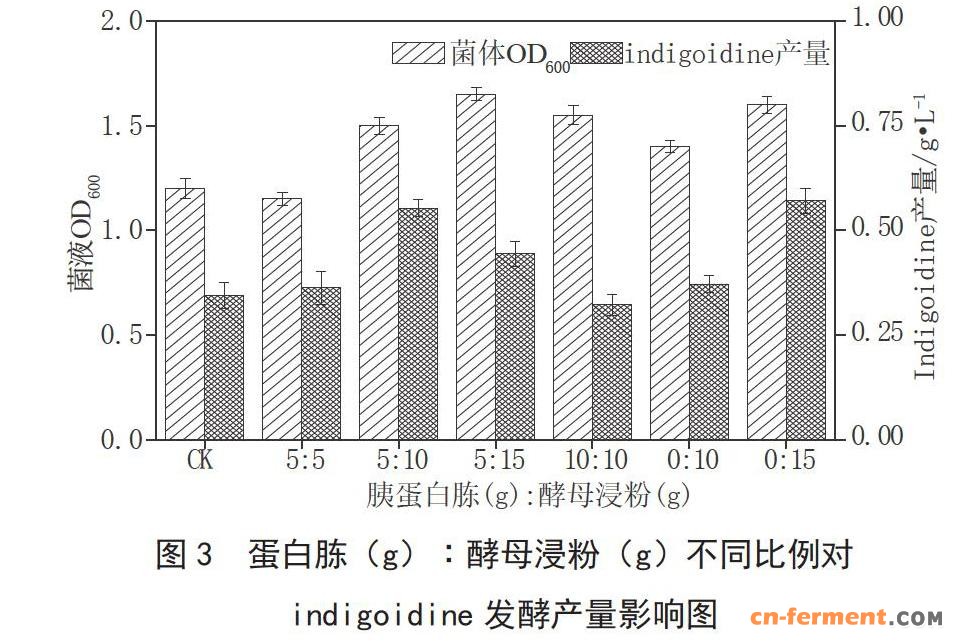 按照1.4.2的方法,发酵前期37 ℃培养4 h后变温至28 ℃培养12 h,测定发酵液中Indigoidine的产量。由图3可知,基础发酵培养基的产量为0.35 g·L-1,当胰蛋白胨(g):酵母浸粉(g)为5∶10、0∶15时产量最高分别为0.55 g·L-1、0.57g·L-1,其次是胰蛋白胨(g):酵母浸粉(g)为5∶15的产量为0.44 g·L-1,上述3个比例的菌体浓度与色素产量都大于对照。