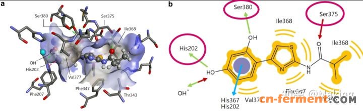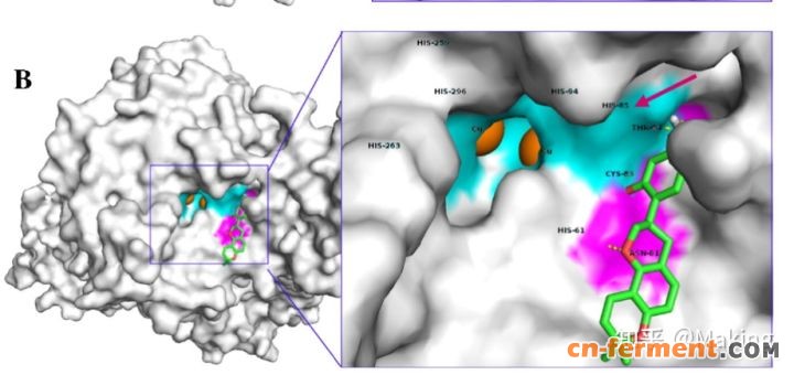 2016年,关于它与酪氨酸酶的作用机理又有了进一步的研究,福建莆田学院的Chen也发表了关于光甘草定与酪氨酸酶的分子对接模型,他们发现,C-4羟基与活性中心残基His-85(紫色箭头所示)之间形成两个氢键,而C-2羟基与His-85之间仅形成一个氢键。因此,可以推测,在酪氨酸酶抑制作用中,C-4羟基可能比C-2羟基更重要。这一项发现与1998年,日本学者Tomohiro对光甘草定化学结构中不同位置的两个羟基的研究结果高度一致,即4′位羟基相比于2′位羟基,对黑色素合成的抑制作用的影响程度更大。