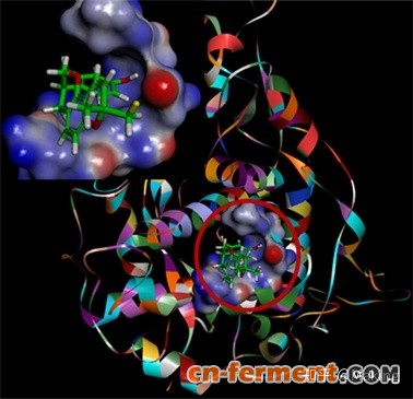 从三维立体图可以看到,光甘草定分子嵌合进入酪氨酸酶的活性穴槽空腔中,图中红色圆圈所示。
