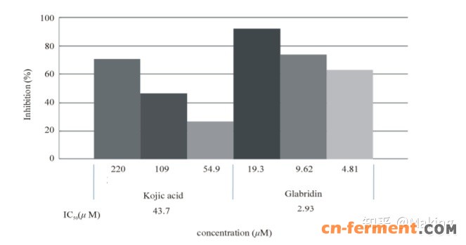 在《Isolation, Identification and Tyrosinase Inhibitory Activities of the Extractives from Allamanda cathartica》和《Effects of Kojic acid, Arbutin and Vitamin C on cell viability and melanin synthesis in B16BL6 cells》可知光甘草定酪氨酸酶抑制率是曲酸的 15 倍 ,维生素C的近 200~250 倍。