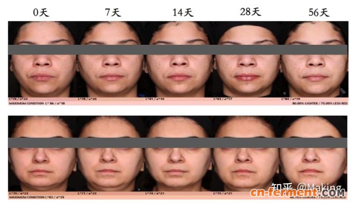 那么结果如何?经过坚持使用含0.04%的光甘草定-90 的乳液56天,L值提升80%,a值下降了70%以上。面部案例改善也非常明显。