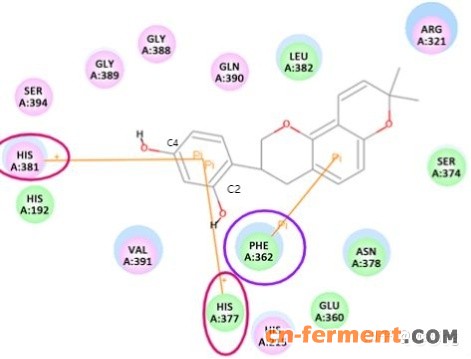 光甘草定含有双羟基(C2和C4位)的苯环与酪氨酸酶的氨基酸残基HIS 381及HIS377形成了两个π-cation键(π-阳离子键,一种非共价结合相互作用形式),另外一个苯环与氨基酸残基Phe 362形成了一个π-π相互作用力。