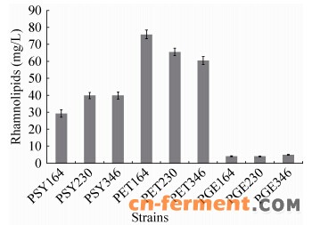 | 图2 rhlAB基因以不同形式在大肠杆菌表达时鼠李糖脂的产量Figure 2 The rhamnolipid production in E. coli with different expressions of rhlAB. Strains with high-copy-number expression of rhlAB: PSY164, PSY230, PSY346; strains with medium-copy-number expression of rhlAB: PET164, PET230, PET346; strains with single-copy-number expression of rhlAB: PGE164, PGE230, PGE346. |