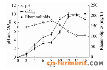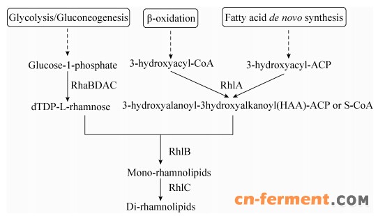 鼠李糖脂是一种由多种同族结构组成的阴离子生物表面活性剂,其亲水基团一般由1−2分子的鼠李糖环构成,疏水基团则由不同碳链的β-羟基烷酸构成,分子式可表述为Rhl-Cx、Rhl-Cx-Cy、Rhl-Rhl-Cx或Rhl-Rhl-Cx-Cy (Rhl为鼠李糖;x、y通常为8-14)[1]。鼠李糖脂能显著降低流动相之间的界面张力,具有优良的去垢、乳化和絮凝能力,并且无毒及可生物降解,在采油工业、化妆品、环境修复中具有巨大的应用潜力[2]。另外,通过微生物发酵生产鼠李糖脂并水解得到鼠李糖,有望替代天然植物中提取获得的鼠李糖,成为食用型甜味剂鼠李糖的潜在来源[3]。