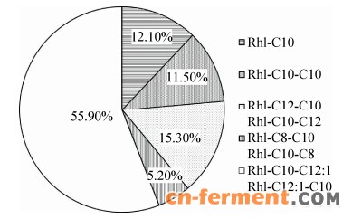 | 图6 大肠杆菌TIB-RAB226合成的鼠李糖脂同系物的相对含量Figure 6 Relative abundance of rhamnolipid congener produced by E. coli TIB-RAB226. |