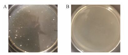 Figure 3 The colonies of transformants on medium containing 1.5 mg·mL-1 hygromycin B after transforming Cp-1 strain with pAN7-1 (A); and the negative control of transformation of Cp-1 strain (B) |