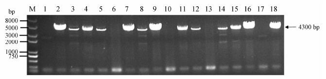 为了检测质粒pAN7-1是否转入Cp-1菌株中,从上述转化平板上随机挑取16个抗性转化子,重新接种于含1.5 mg·mL-1潮霉素的新鲜培养基上,避光培养5~7天,可观察到转化平板上的单菌落在含药培养基仍正常生长 (图 4)。用牙签挑取少量的菌丝体,提取各转化子的基因组DNA。随后,以各转化子的基因组 DNA作为模板,使用引物hph-F和hph-R进行PCR扩增,扩增后PCR产物进行琼脂糖凝胶电泳,如图 5所示,诊断PCR结果表明,以大部分转化子的基因组DNA为模板时 (除6、10、13和17号外),扩增得到的产物大小均与阳性对照中 (pAN7-1质粒为模板) 扩增得到的产物大小一致,均为4.3 kb左右; 而阴性对照 (野生型基因组 DNA作为模板时) 并未扩增得到目的条带。以上结果表明,质粒pAN7-1已成功转化Cp-1菌株,hph基因片段已整合在Cp-1菌株的基因组DNA上且发挥了抗潮霉素的功能。