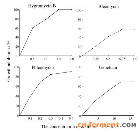 Cp-1菌株对不同抗生素的敏感性测试将Cp-1菌株的菌丝体接于T25D培养基上培养5~7天,待长满平板后,用直径0.5 cm的打孔器取相同面积的菌体转接于分别含有不同浓度的潮霉素 (hygromycin B)、腐草霉素 (phleomycin)、博来霉素 (bleomycin) 和遗传霉素 (geneticin) 的培养基上,待菌丝长满不含有抗生素的平板后,分别测定各平板菌丝体的直径,计算不同抗生素对Cp-1菌株的生长抑制率。