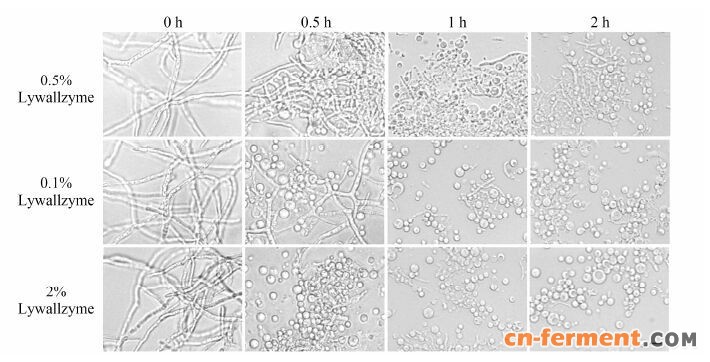 不同酶解液浓度和酶解时间对原生质体制备的影响离心收集上述新鲜幼嫩的菌丝体,10 000 r·min-1,10~15 min,用无菌水洗涤菌体2~3次后,使用0.7 mol·L-1 KCl溶液作为渗透压稳定剂来重悬菌丝体,同时取25、50和100 mg溶壁酶溶于2 mL的0.7 mol·L-1 KCl溶液中,经0.22 μm滤膜进行过滤得到不同浓度的酶解液。随后,取1 g湿重的菌体溶于3 mL的0.7 mol·L-1 KCl溶液,并将上述2 mL酶解液分别加入3份上述菌液中进行酶解,此时酶解液终浓度分别为0.5%、1% 和2%,将其置于25 ℃、100 r·min-1的摇床上进行酶解,利用显微镜观察在不同酶解液浓度和酶解时间下原生质体的形成情况。