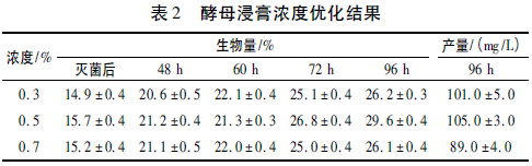 酵母浸膏最适浓度的筛选结果见表2。胞内代谢产物的产量受生物量影响较大,生物量提高,后期产素相应提高,由表2可知,在酵母浸膏浓度为0.5%时,生物量最大,此时多杀菌素发酵产量最高。所以采用0.5%的酵母浸膏。