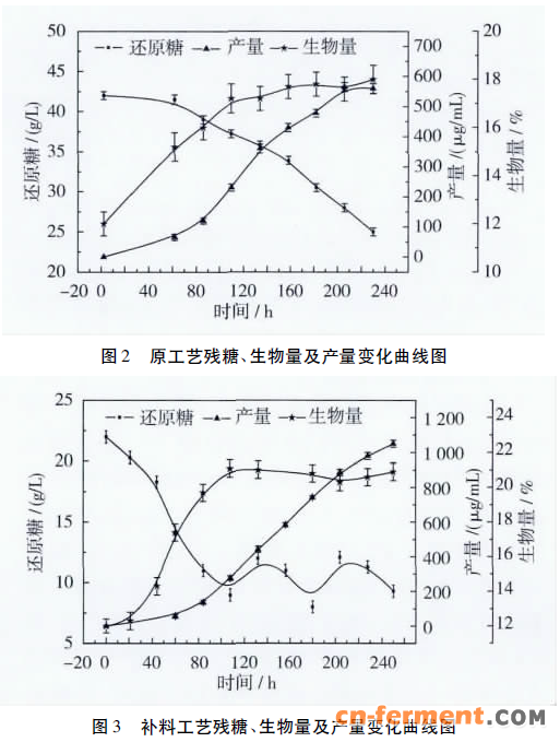 以葡萄糖作为主要碳源和能源生产抗生素时容易导致葡萄糖效应,抑制次级代谢产物的合成,所以一般采用葡萄糖的补料或流加来减少其抑制作用。图2、图3结果表明,残糖全程控制在相对稳定较低的水平,生物量在100h左右达到最大,缩短了迟滞期,抗生素合成起步单位较对照提前24h。250h发酵单位达到1050μg/mL,较对照提高82%。