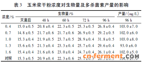 在固定0.5%酵母浸膏的基础培养基中,添加不同比例的玉米浆干粉。分别培养不同时间后测定生物量及产量,结果如表3所示。摇瓶筛选结果表明添加一定量的玉米浆干粉有利于菌丝生长。随着玉米浆干粉浓度的不断增加,生物量及产量先呈上升趋势,在浓度为1.0%时都达到最高。但是速效氮源也存在类似于葡萄糖的阻遏效应,随着玉米浆干粉的继续增加,生物量的变化表现出抑制作用。