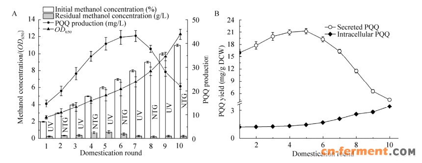 1.3 PQQ高产菌株的高通量筛选1.3.1 高产突变株的快速筛选按照驯化流程进行10轮适应性驯化,每轮驯化后取培养液测定菌浓、甲醇残留浓度和PQQ含量,并进行梯度稀释涂布于含有4%甲醇的固体筛选培养基平板上培养7 d。挑取平板上的单菌落转接于装有1 mL发酵培养基的白色96深孔板中,30 ℃、500 r/min振荡培养5 d。8 000×g离心5 min,吸取上清至透明96孔板中,通过光谱法测定上清液中的PQQ含量。