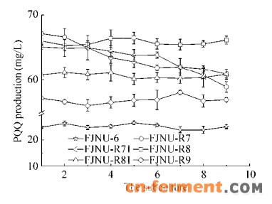 1.3.3 遗传稳定分析将复筛获得的高产突变株在发酵培养基平板上划线连续传代9次,每代次随机挑取5个单菌落进行摇瓶培养,测定其PQQ产量,验证菌株的遗传稳定性。